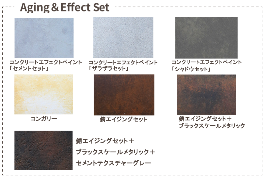 錆風やコンクリート風、黒皮鉄風や日焼けしたような古びた風合いなど、様々なジャンルのエイジングを誰でも簡単に表現できる、「エイジング&エフェクトシリーズ」 ・写真(画像)や塗装事例だと色や風合いが分かりにくい ・小物のDIY、どのエイジング塗装が部屋の雰囲気に合いそうかイメージ出来ない ・まずはエイジング&エフェクトシリーズを色々見比べてみたい というお問い合わせにお答えさせていただくため、エイジング&エフェクトシリーズの色見本を作成いたしました。