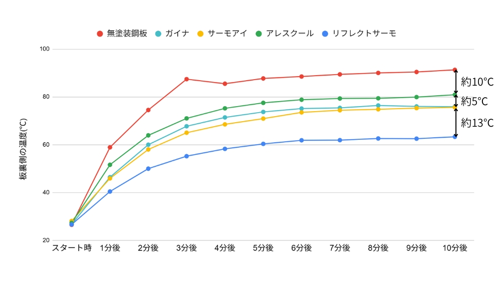 実験の結果、「リフレクトサーモ」を塗装した板裏面は、「ガイナ」を塗装した板裏側よりも約13℃温度が低いという結果なりました。